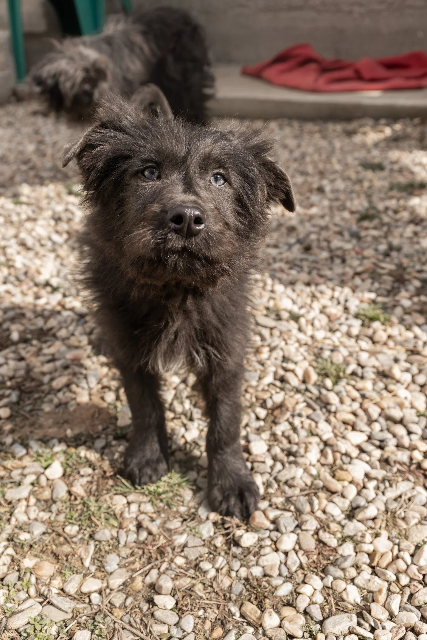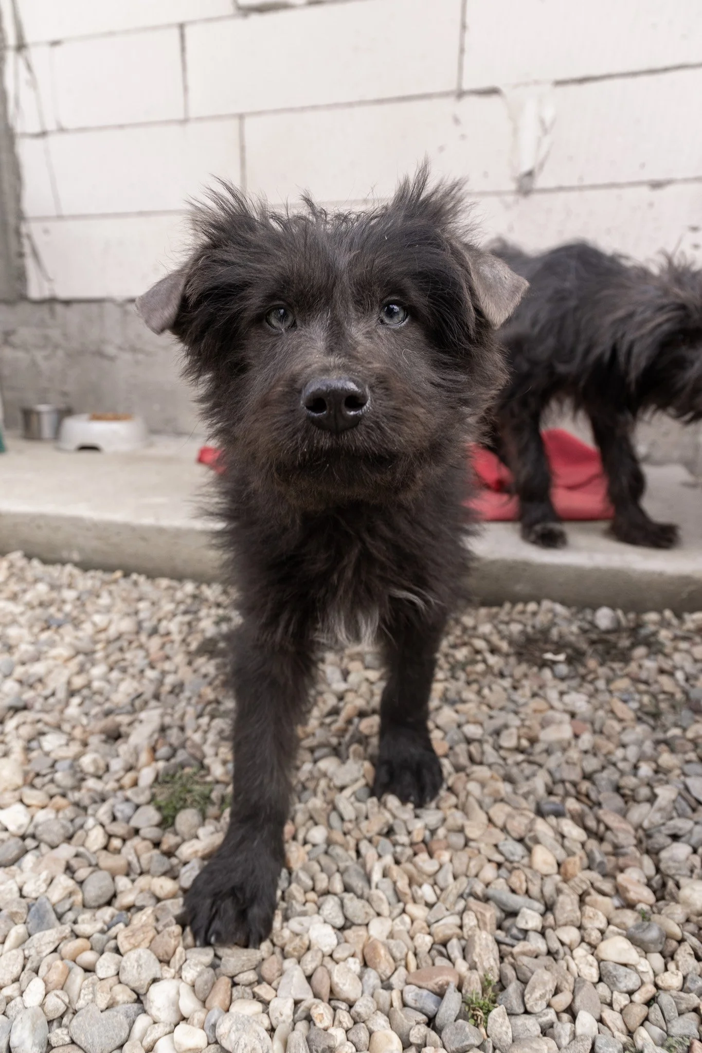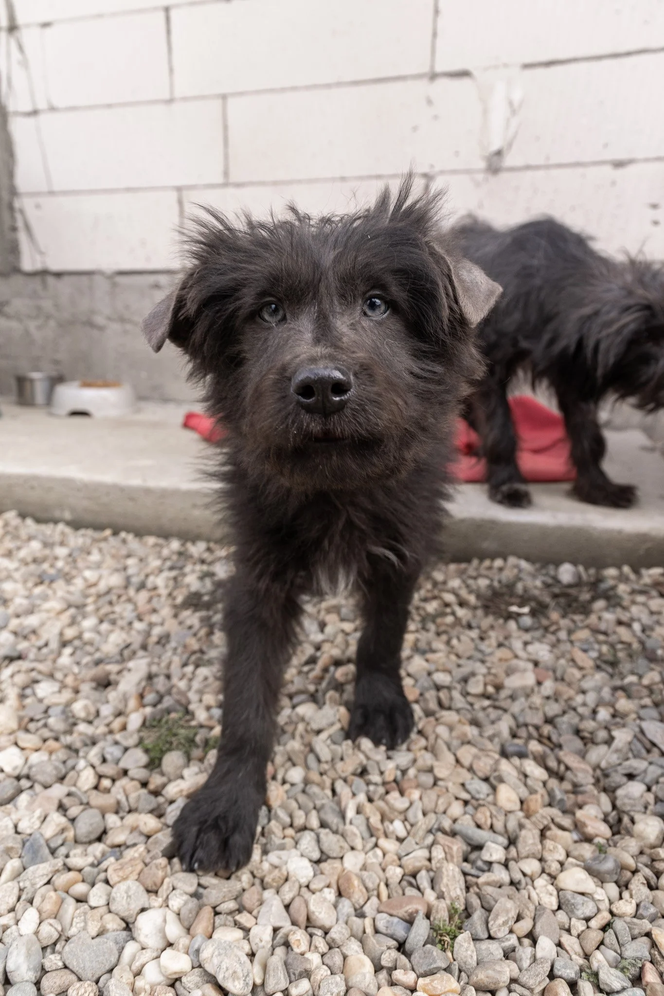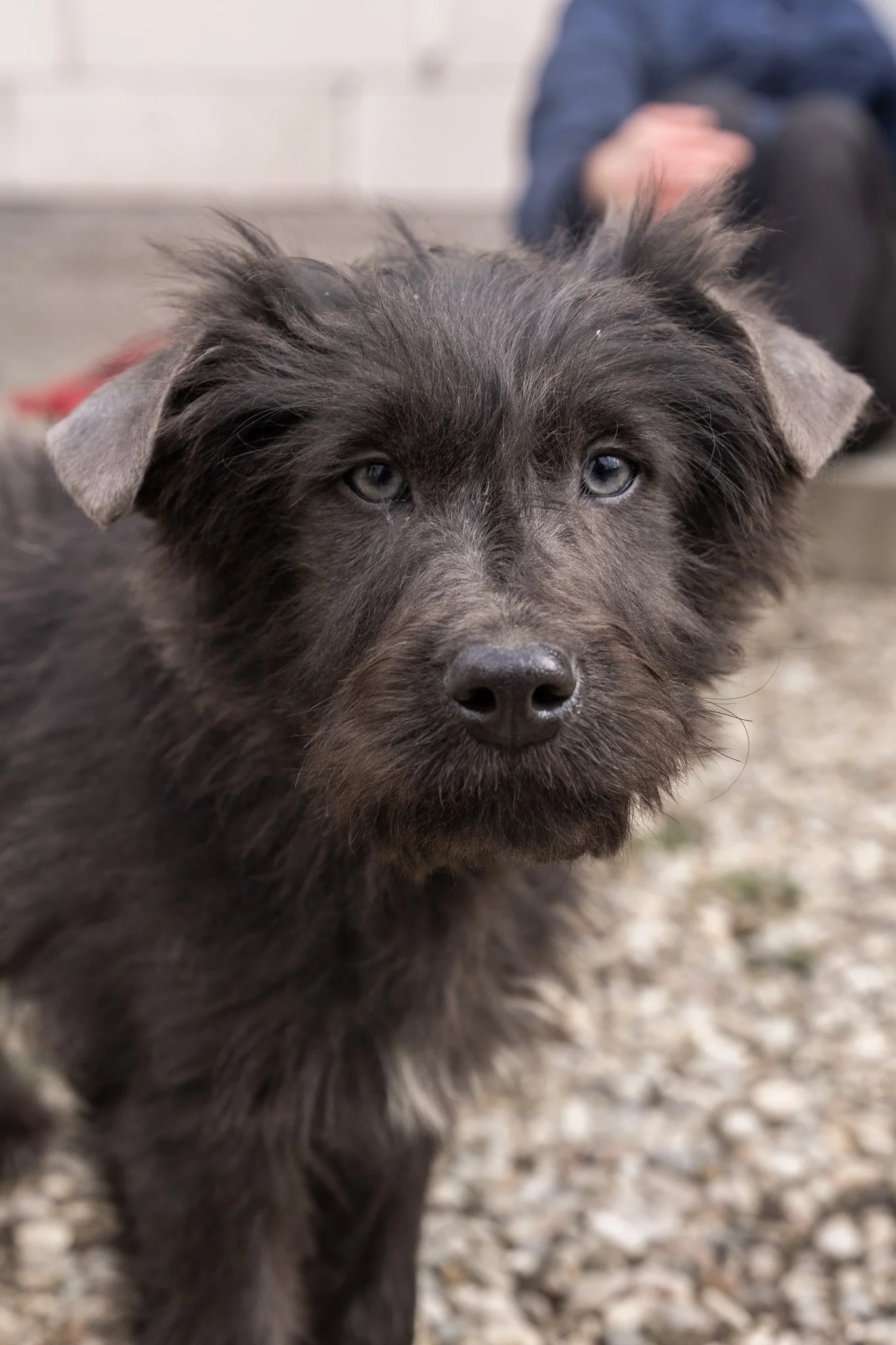 Benny ist ein optisches Phänomen: Sein Fell ist tiefschwarz und wuschelig, aber wenn er einen ansieht, bleibt die Welt kurz stehen. Er hat wunderschöne, leuchtend blaue Augen, die einen direkt ins Herz treffen. Er sieht aus wie ein kleiner Sternenhimmel in einer Winternacht.
